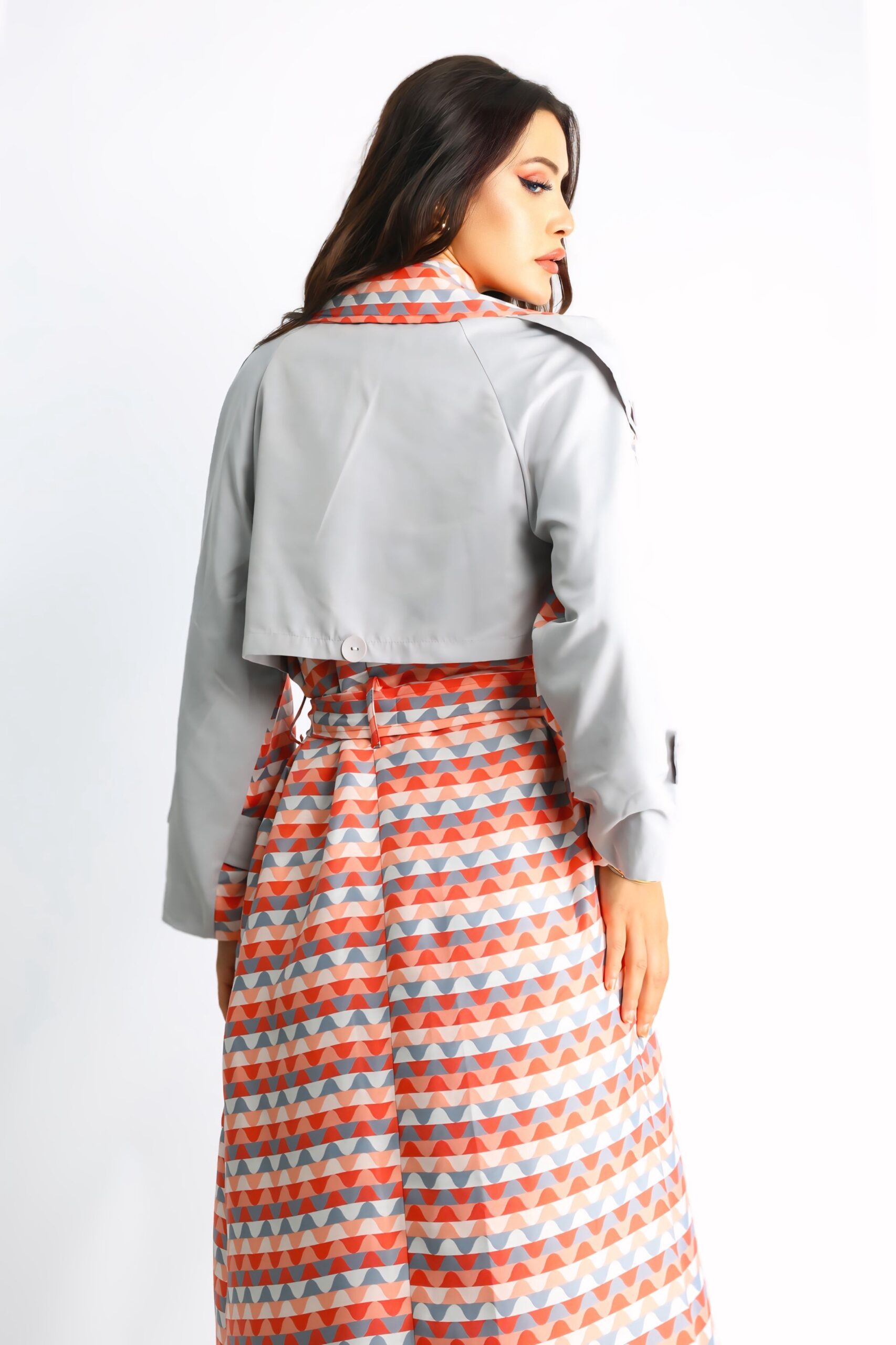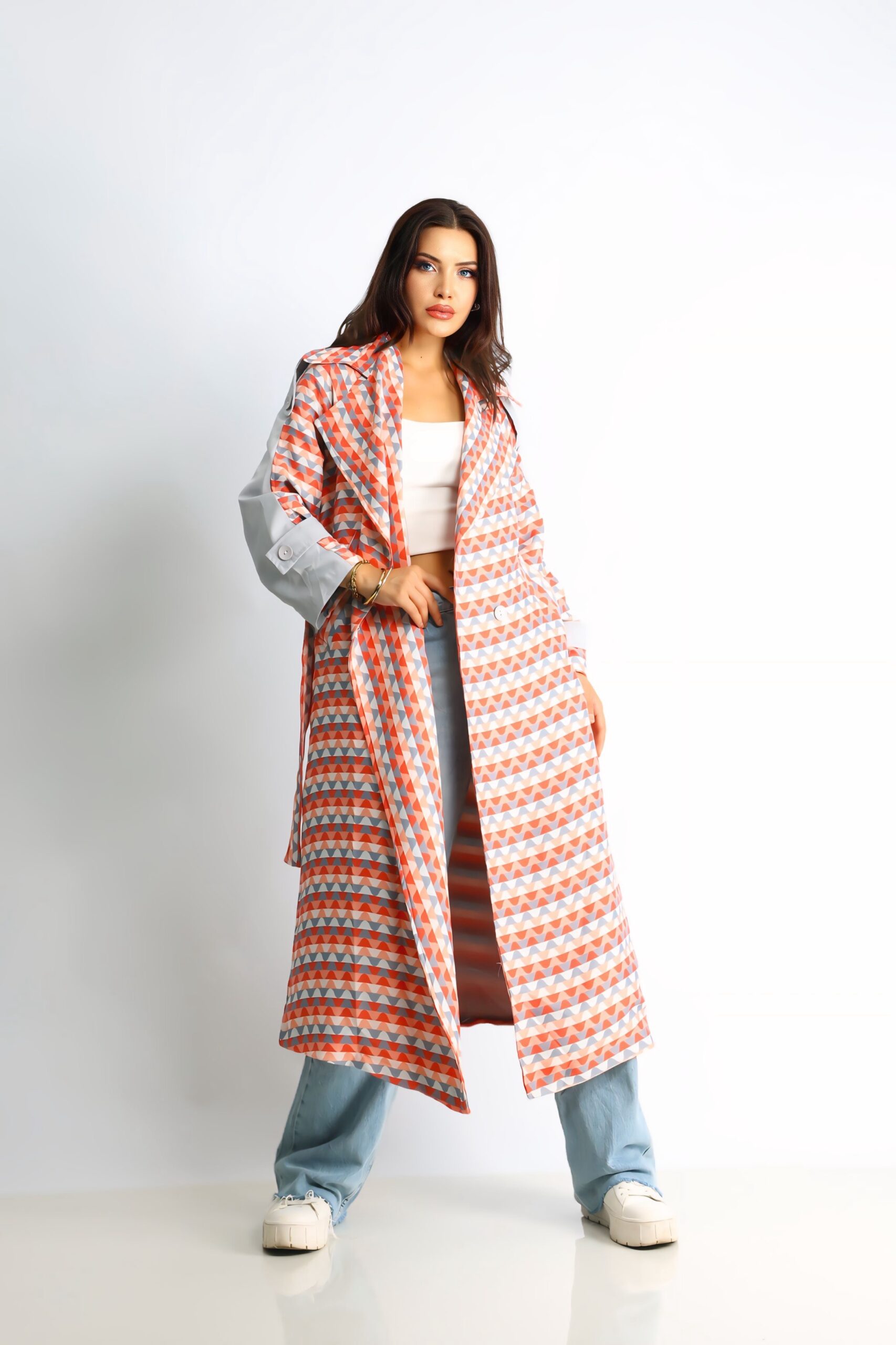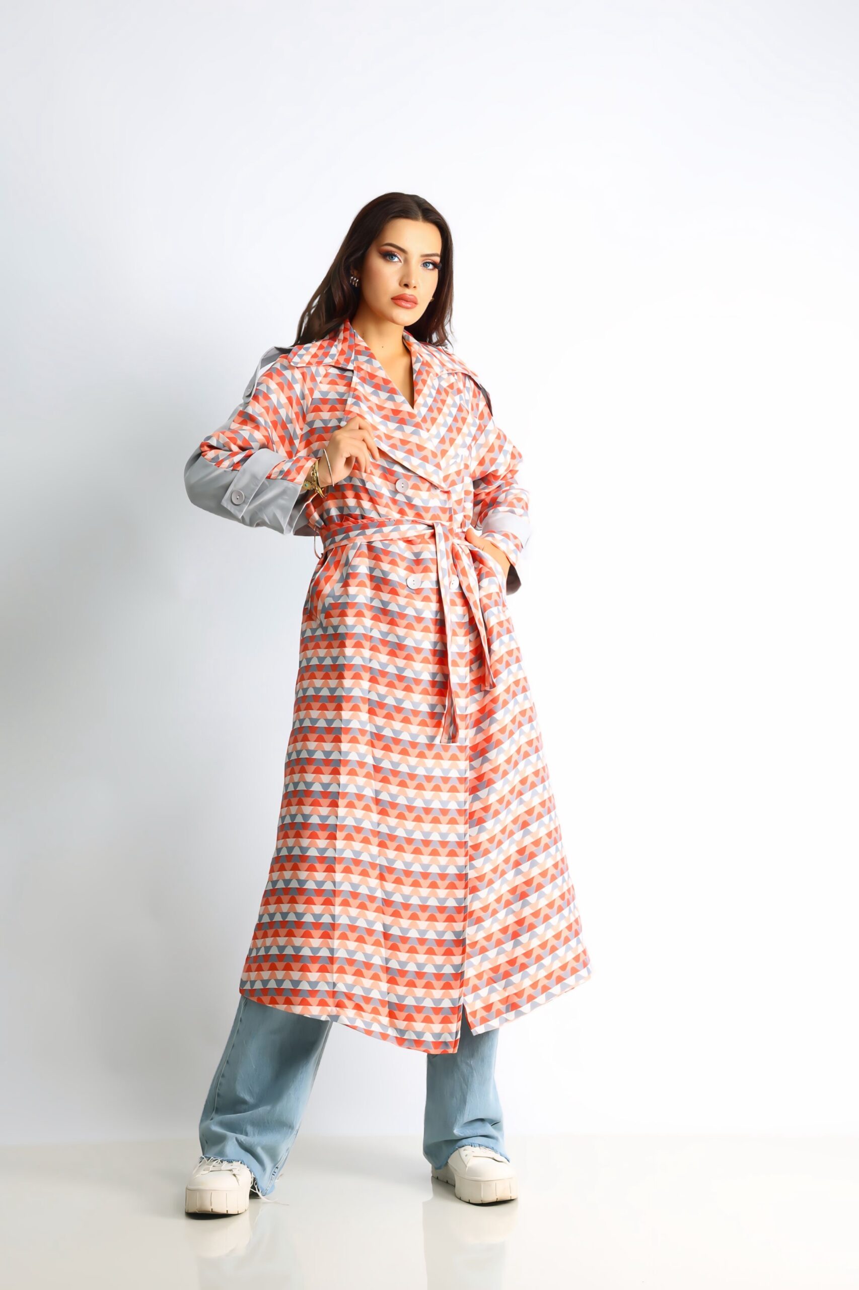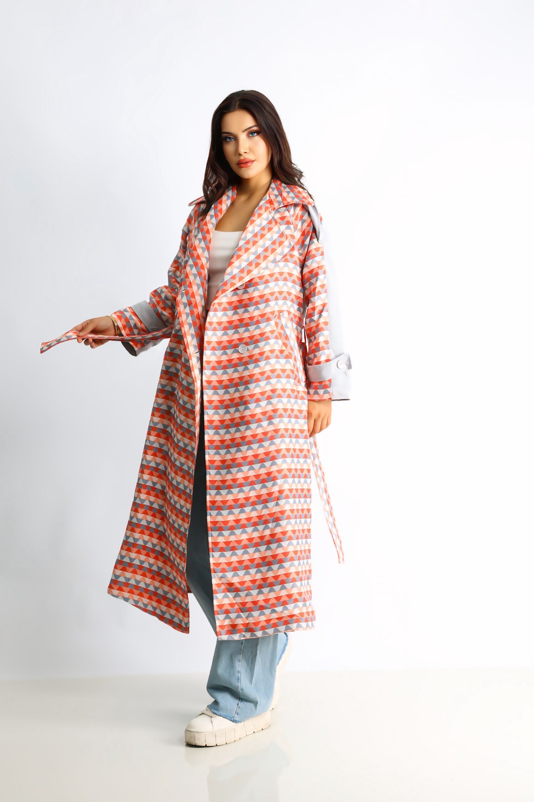 Enerjik turuncu rengi ve dinamik zikzak deseniyle öne çıkan bu oversize trençkot, dikkat çekici bir stil sunar. Rahat kesimi ve kaliteli kumaşı, konforu ön planda tutarken, enerjik desenleriyle kış kombinlerinize renk katar. Bel kemeri ve düğme detaylarıyla şıklığınızı tamamlar, günlük stilinize modern bir dokunuş ekler.
