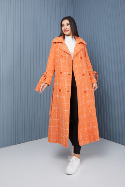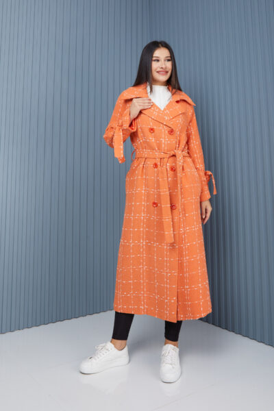 Enerjik turuncu rengi ve dinamik zikzak deseniyle öne çıkan bu oversize trençkot, dikkat çekici bir stil sunar. Rahat kesimi ve kaliteli kumaşı, konforu ön planda tutarken, enerjik desenleriyle kış kombinlerinize renk katar. Bel kemeri ve düğme detaylarıyla şıklığınızı tamamlar, günlük stilinize modern bir dokunuş ekler.