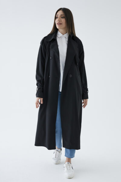 Zarif ve çağdaş bir şıklık sunan bu siyah trençkot, oversize kesimiyle mükemmel bir rahatlık sağlar. Kaliteli kumaşı ve minimalist tasarımı, her durumda şık ve konforlu bir görünüm sunar. Bel kemeri detayı ve düğmeli kapama, stilinizi tamamlayarak çeşitli kombinlerle uyum sağlar.
