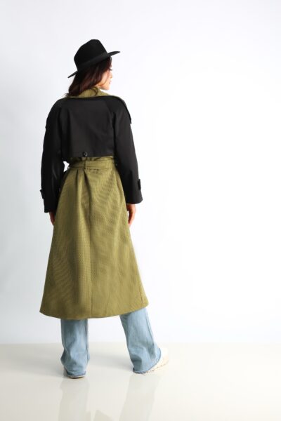 Sofistike ve modern bir tarz sunan bu oversize trençkot, hardal rengindeki kazayağı deseniyle dikkat çeker. Rahat kesimi ve kaliteli kumaşı, konforu ön planda tutarken, desenin şıklığına zarif bir dokunuş ekler. Bel kemeri ve düğme detaylarıyla hem günlük hem de özel günlerde şıklığınızı tamamlar.
