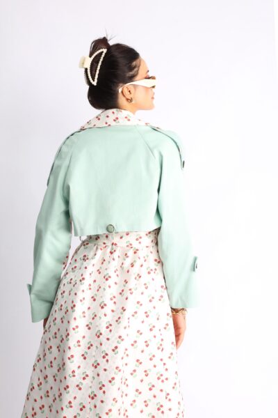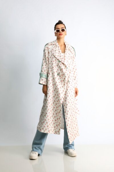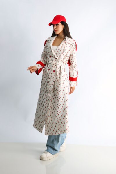 Neşeli ve dikkat çekici bir stil sunan bu oversize trençkot, beyaz zemin üzerinde kırmızı çilek desenleriyle zarif bir görünüm sağlar. Rahat kesimi ve kaliteli kumaşı, hem şıklığı hem de konforu bir arada sunar. Bel kemeri ve düğme detaylarıyla kombinlerinize tatlı bir dokunuş katar.