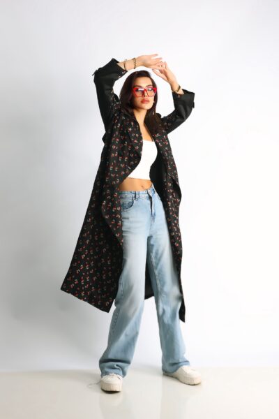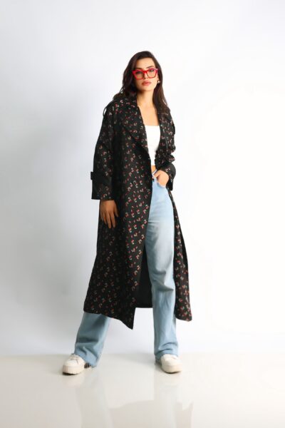 Dinamik ve eğlenceli bir stil sunan bu oversize trençkot, siyah zemin üzerinde kırmızı çilek desenleriyle dikkat çeker. Bol kesimi ve rahat kumaşı, konforu ön planda tutarken, enerjik desenleriyle kış kombinlerinize renk katar. Bel kemeri ve düğme detayları, şıklığınızı tamamlayarak çeşitli kombinlerle uyum sağlar.