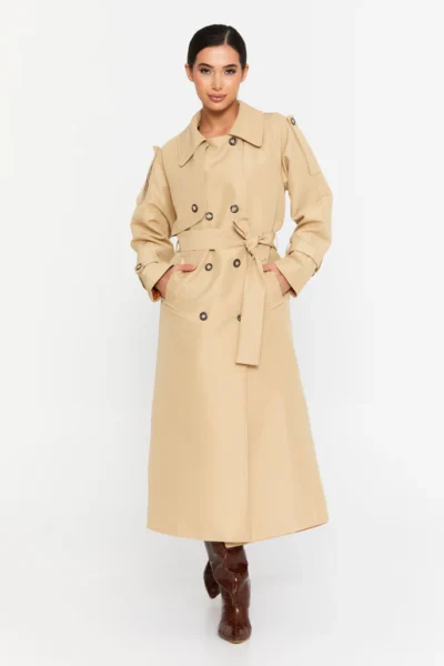 Zarif taş rengi, bu oversize trençkota sofistike bir dokunuş kazandırır. Bol kesimi ve kaliteli kumaşı, rahat bir kullanım sağlar. Bel kemeri ve düğme detaylarıyla şıklığınızı tamamlayan bu trençkot, hem günlük hem de özel günlerde tarzınızı ön plana çıkarır.